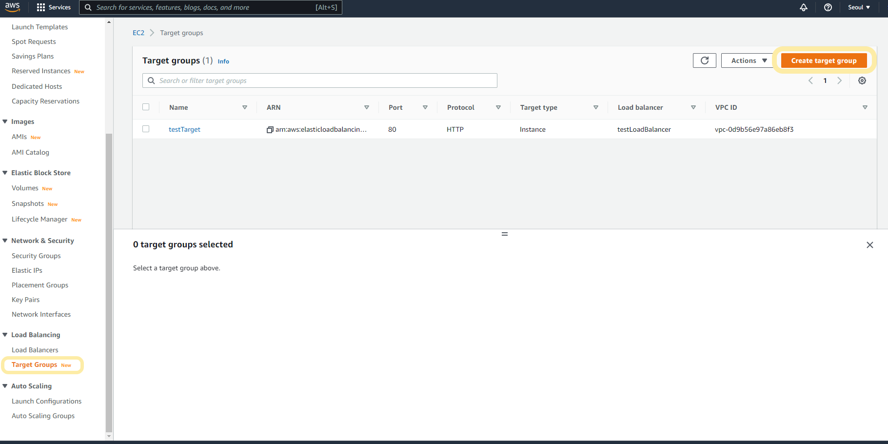 AWS EC2에 접속해서 왼쪽 메뉴 바를 아래로 내리면 'Target Groups' 항목을 찾으실 수 있습니다.