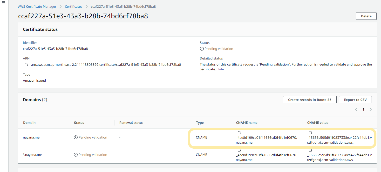 - 발급받은 인증서의 상세 페이지에서 CNAME name과 CNAME value를 확인합니다.'