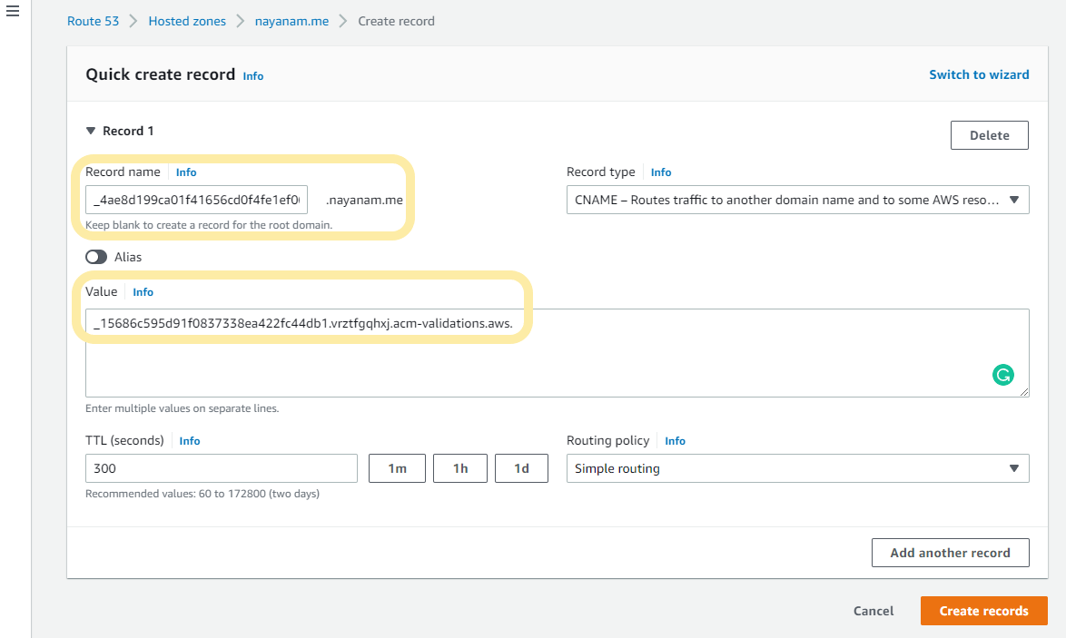 - Route53의 해당 호스트존으로 접속하여 아래와 같이 CNAME 레코드를 생성합니다.인증서의 CNAME name을 Record name으로, CNAME value를 Value값으로 지정후 'Create Record' 버튼을 클릭합니다.