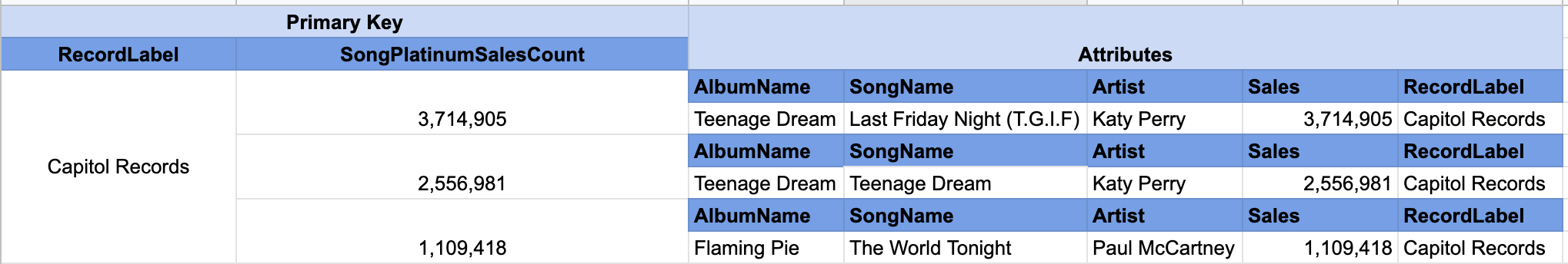 아래는 RecordLabel을 파티션 키로 사용해 플래티넘 송을 가져오는 쿼리문이다.(아이템들은 판매량을 기준으로 소팅된다)